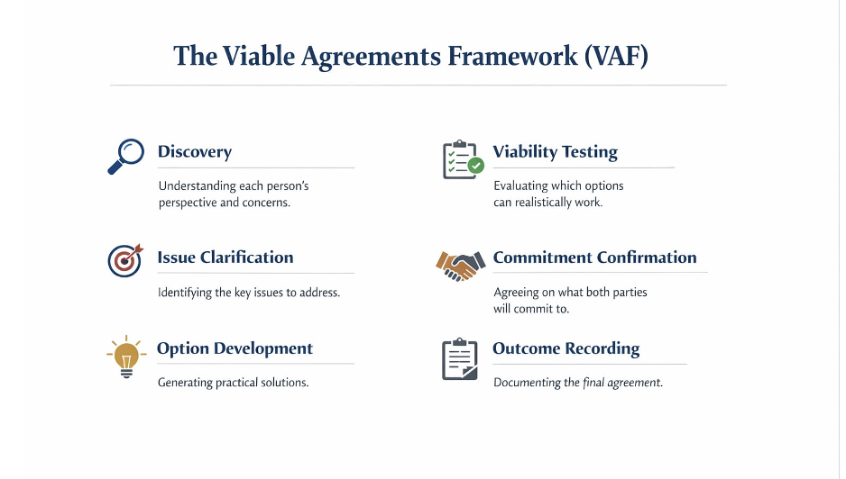 The Viable Agreement Framework (VAF) provides a structured pathway through dispute. It guides participants to: